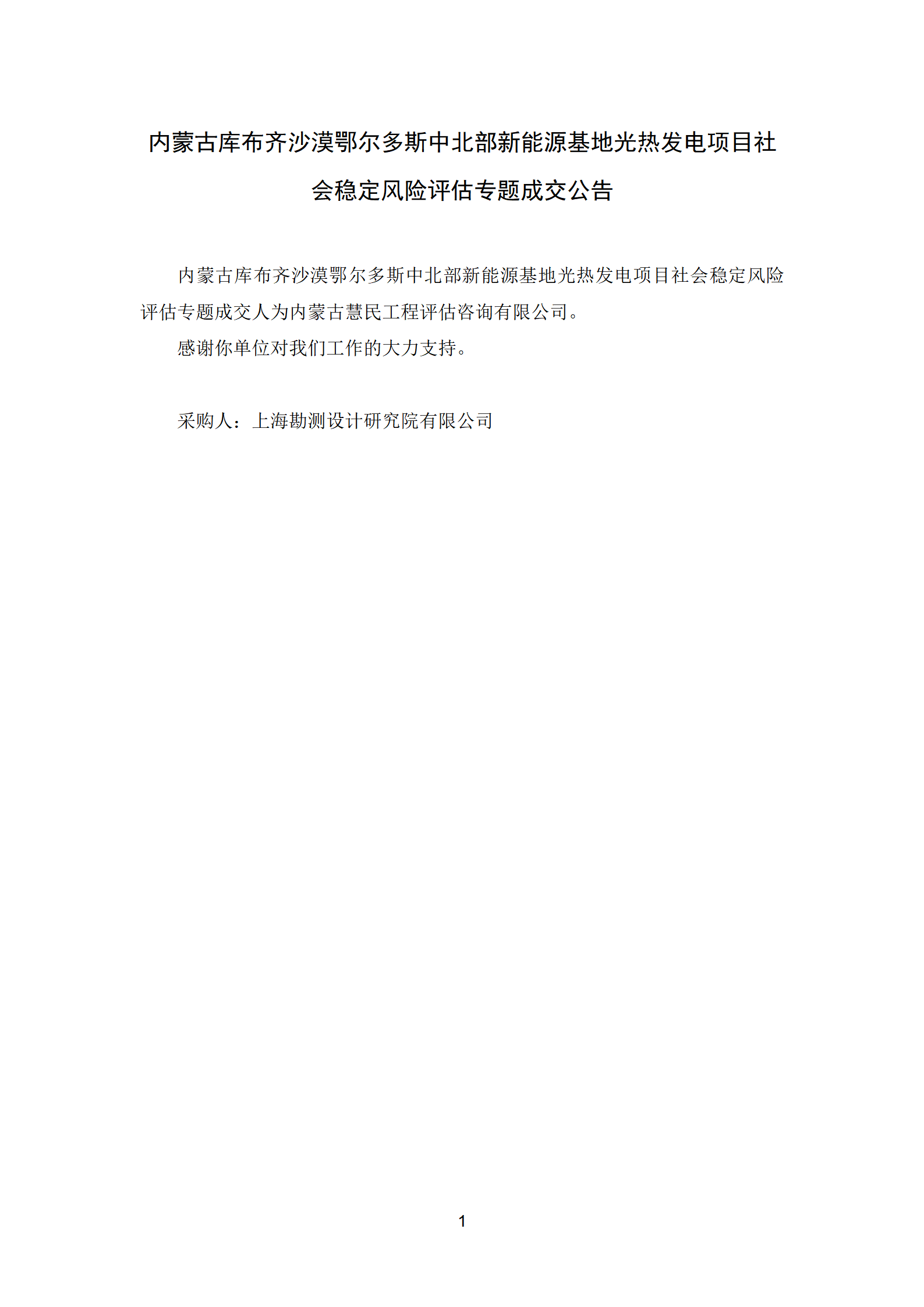 內(nèi)蒙古庫布齊沙漠鄂爾多斯中北部新能源基地光熱發(fā)電項(xiàng)目社會穩(wěn)定風(fēng)險(xiǎn)評估專題成交公告
