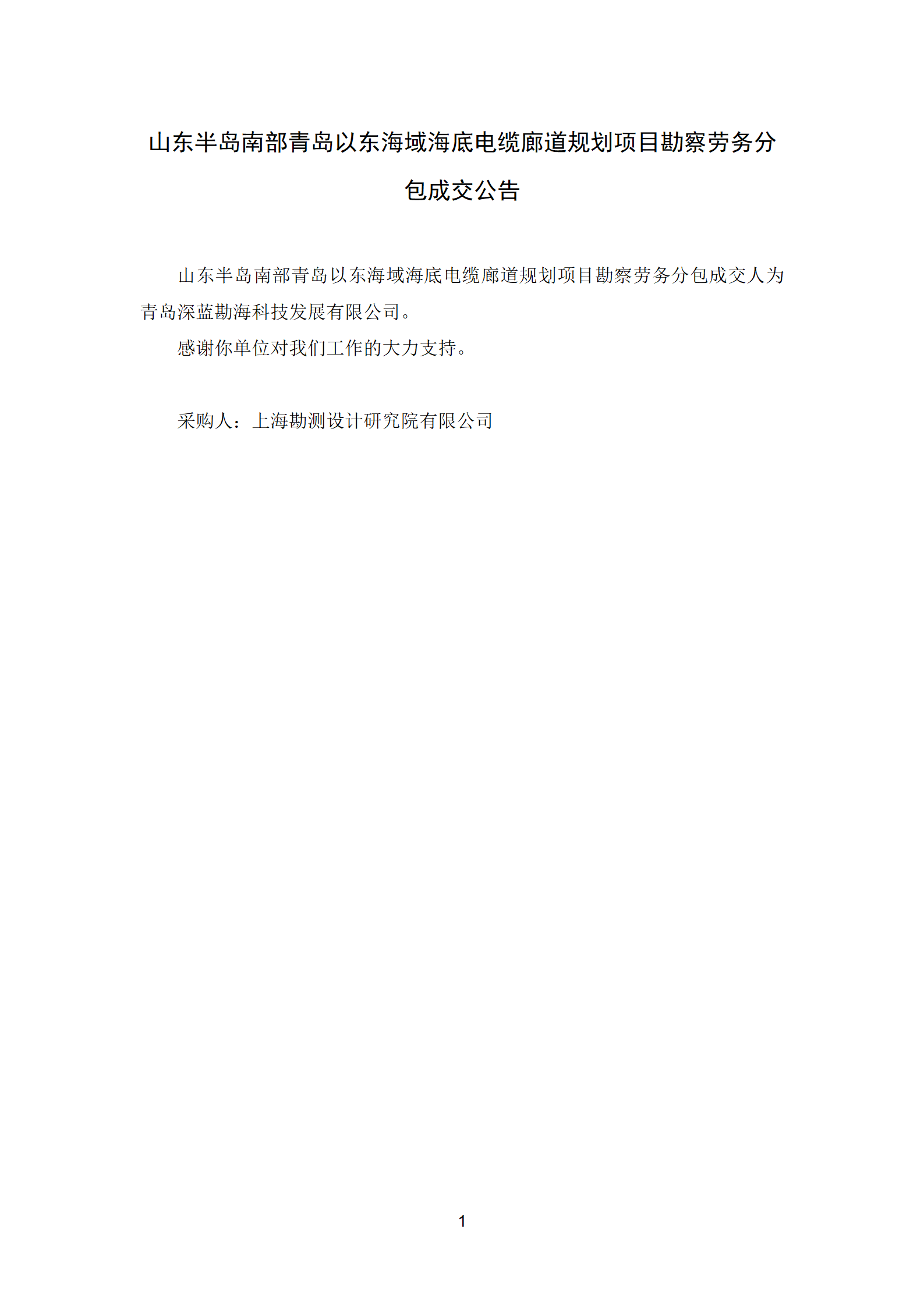 山東半島南部青島以東海域海底電纜廊道規(guī)劃項目勘察勞務(wù)分包成交公告